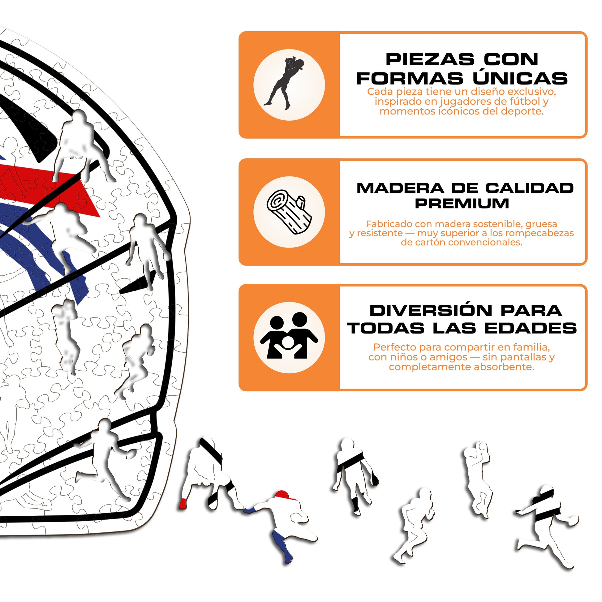 Cada pieza del rompecabezas tiene una forma única que representa elementos relacionados con el fútbol americano y poses de jugadores icónicos.