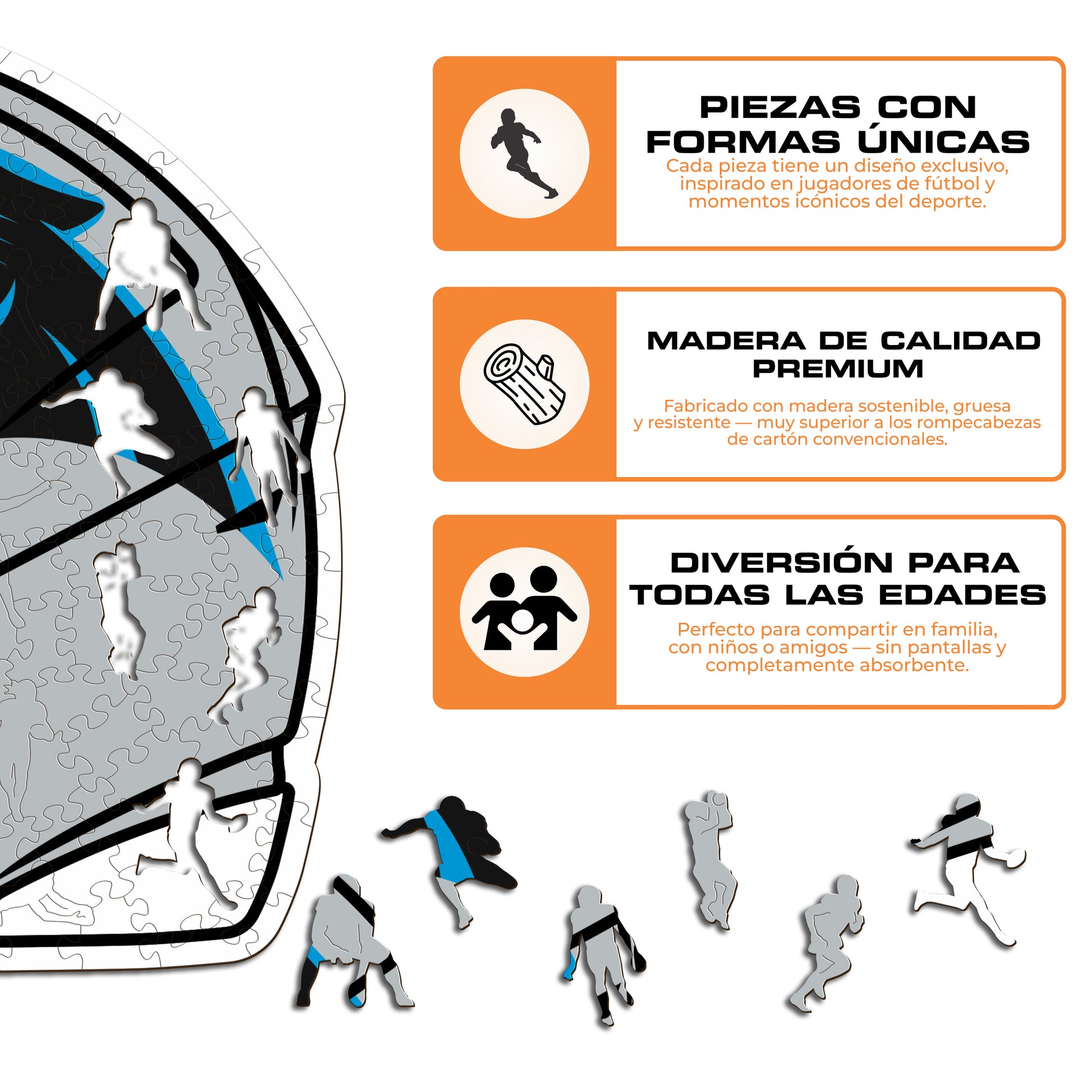 ✓ Cada pieza del rompecabezas tiene una forma única que representa elementos relacionados con el fútbol americano y poses de jugadores icónicos.
