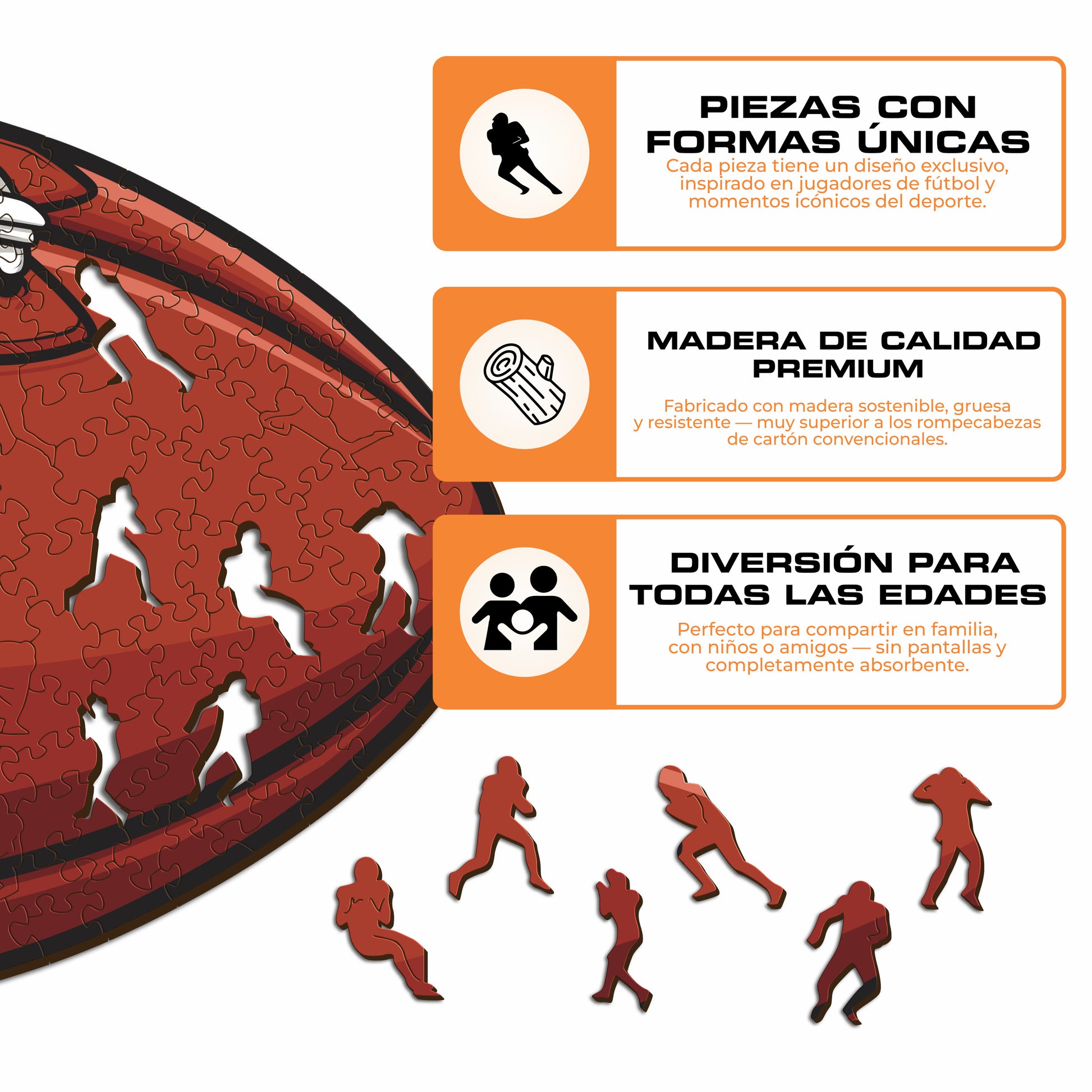 ✓ Cada pieza del rompecabezas tiene una forma única que representa elementos relacionados con el fútbol americano y poses de jugadores icónicos.