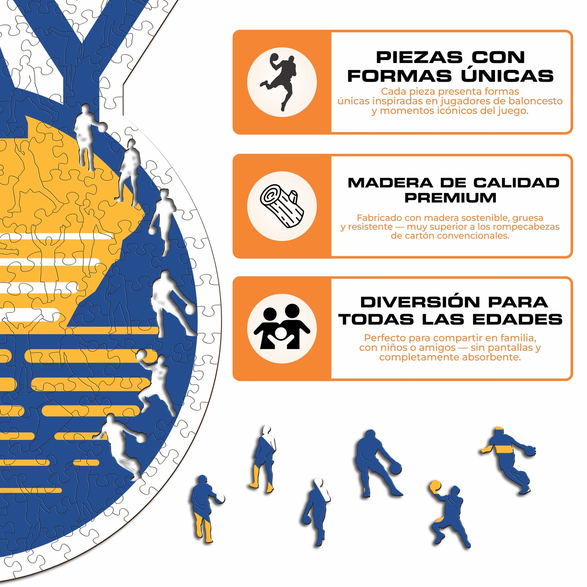 ✓ Cada pieza del rompecabezas tiene una forma única que representa elementos relacionados con el baloncesto y poses icónicas de los jugadores.