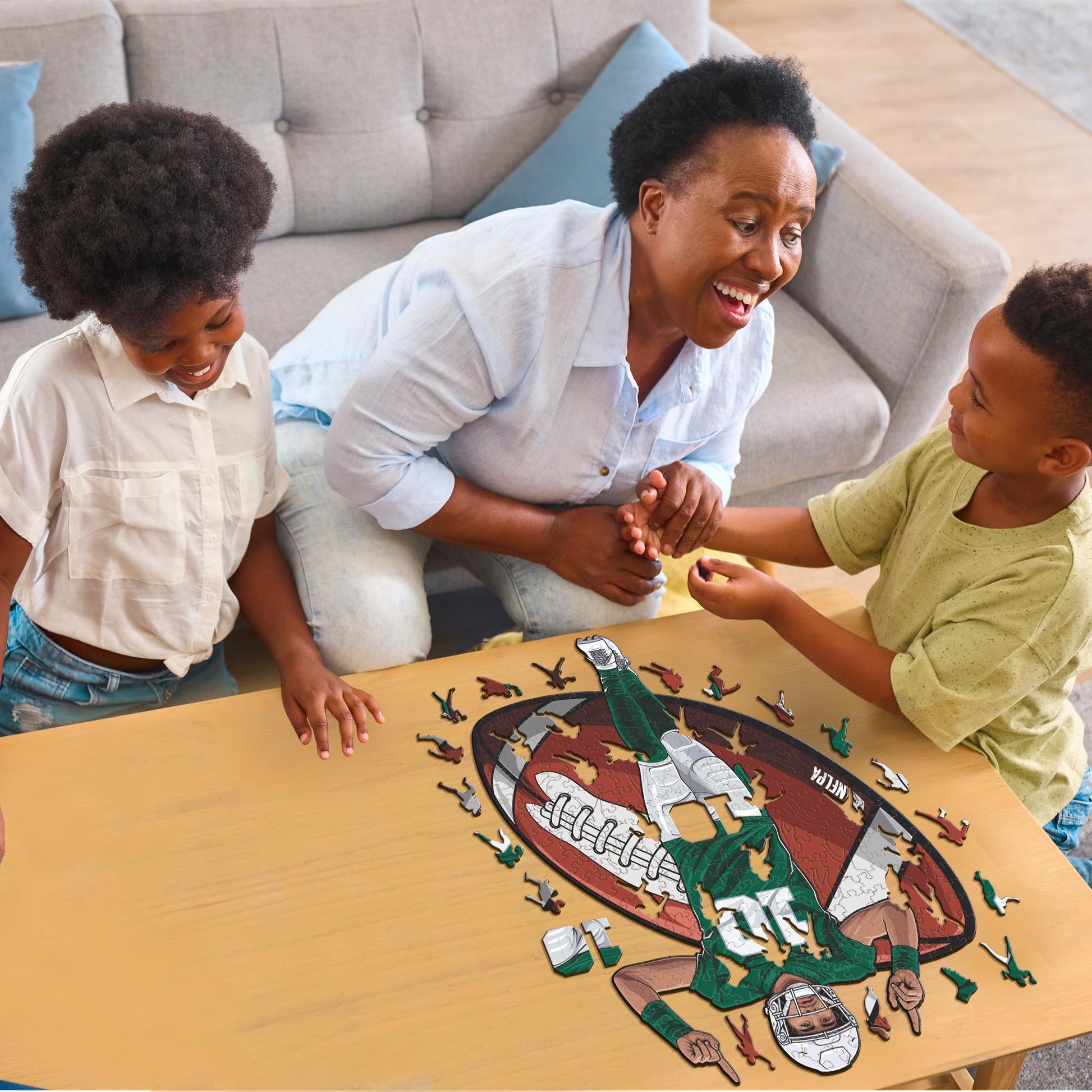 ✓ Cada pieza del rompecabezas tiene una forma única que representa elementos relacionados con el fútbol americano y poses de jugadores icónicos.